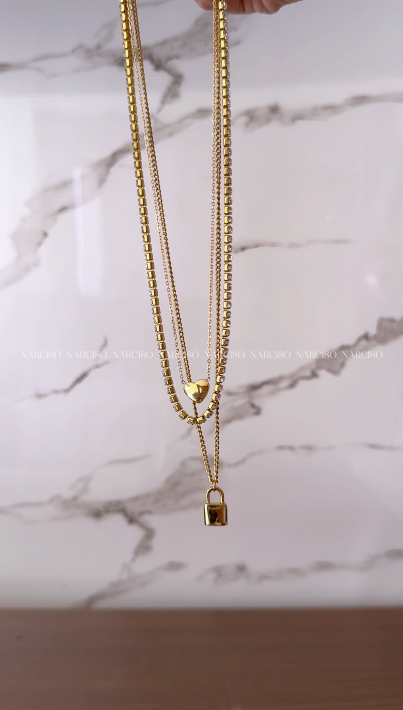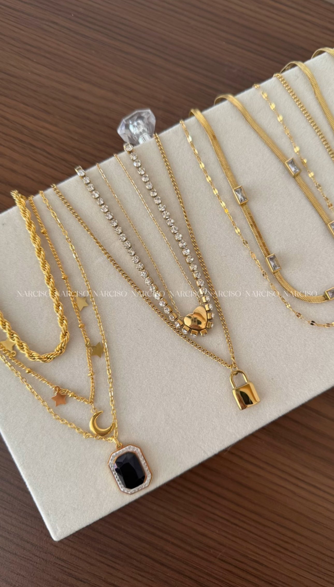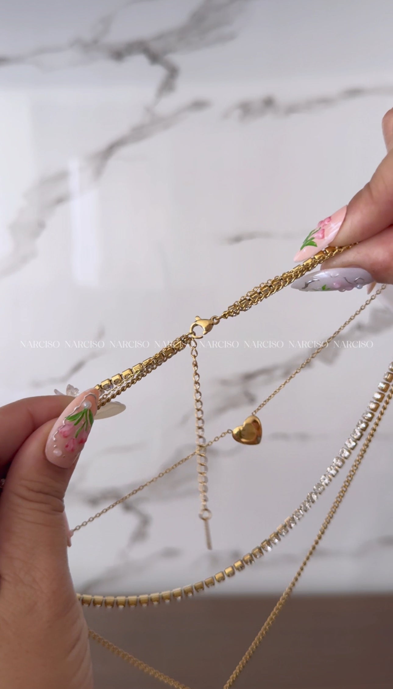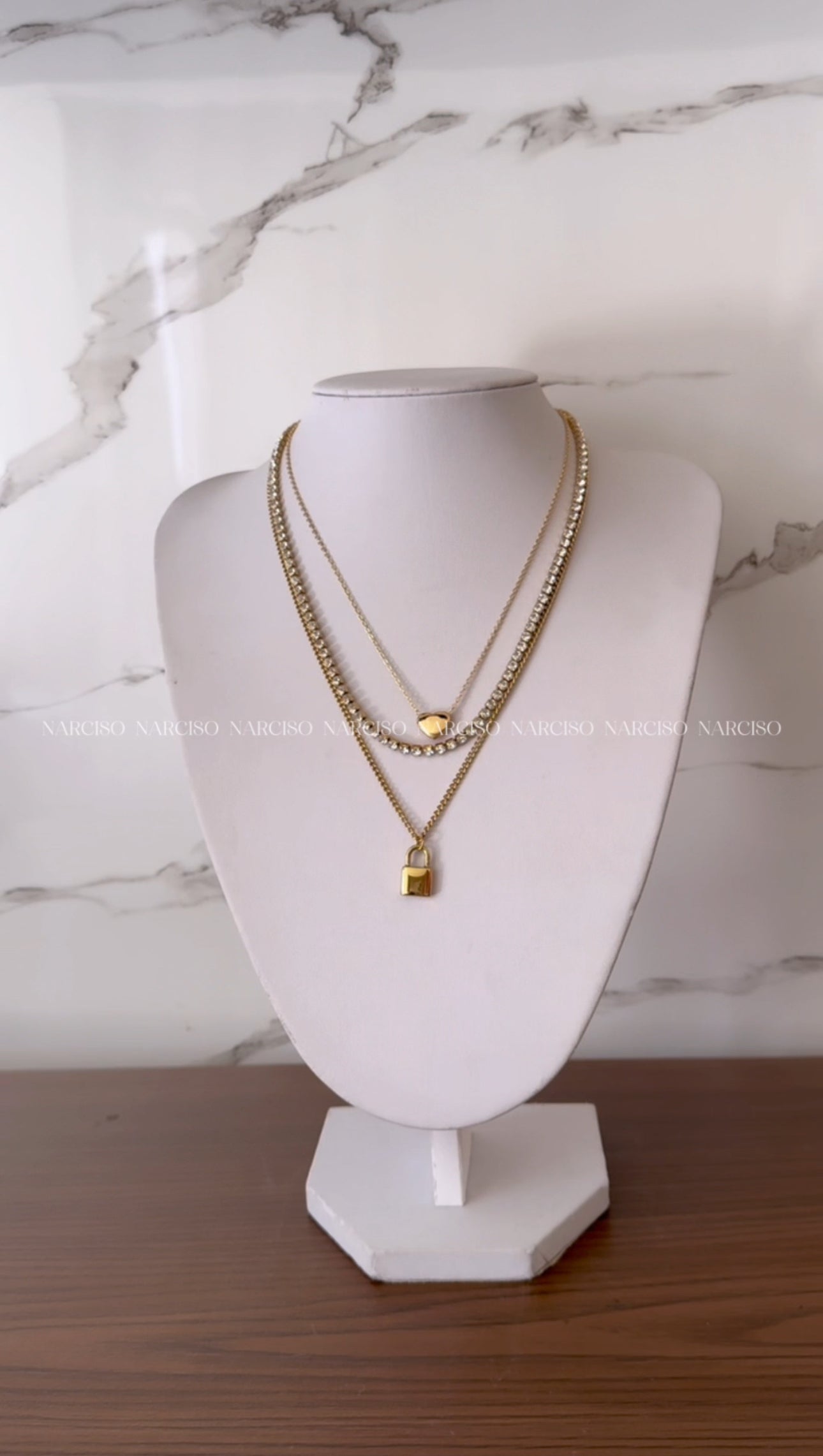 Este collar de tres capas de acero dorado es la combinación perfecta de elegancia y estilo. Con un diseño único que incluye un dije de corazón, gargantilla de circonitas y un candado, este collar es ideal para cualquier ocasión. Conviértete en el centro de atención con este collar versátil y sofisticado.
