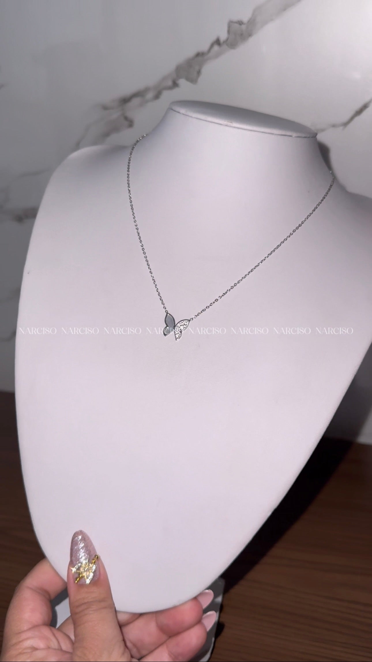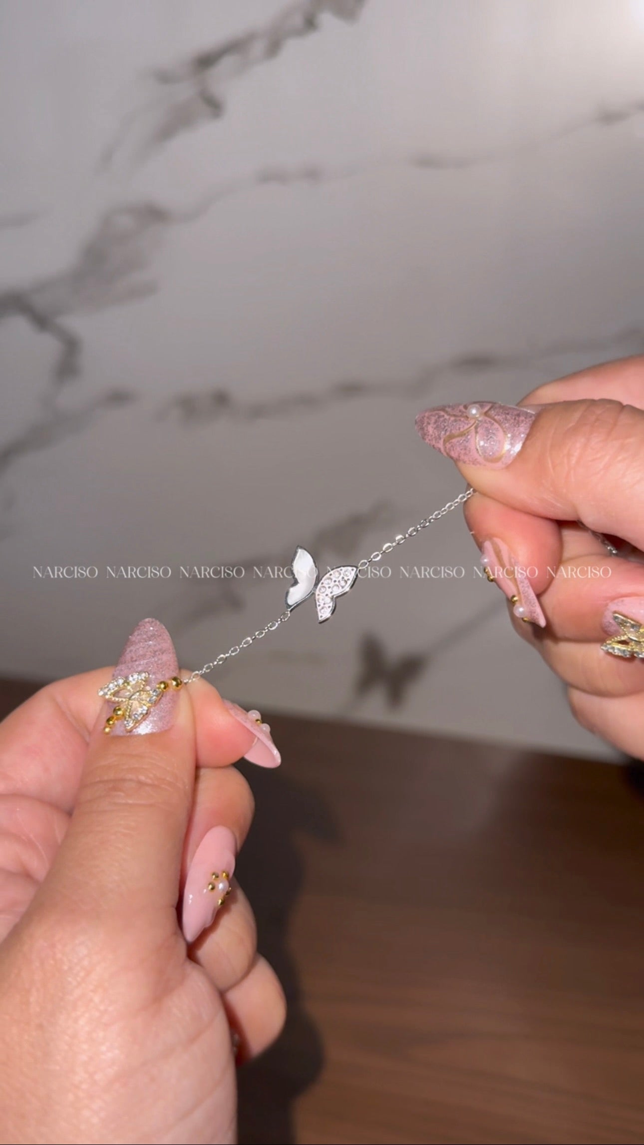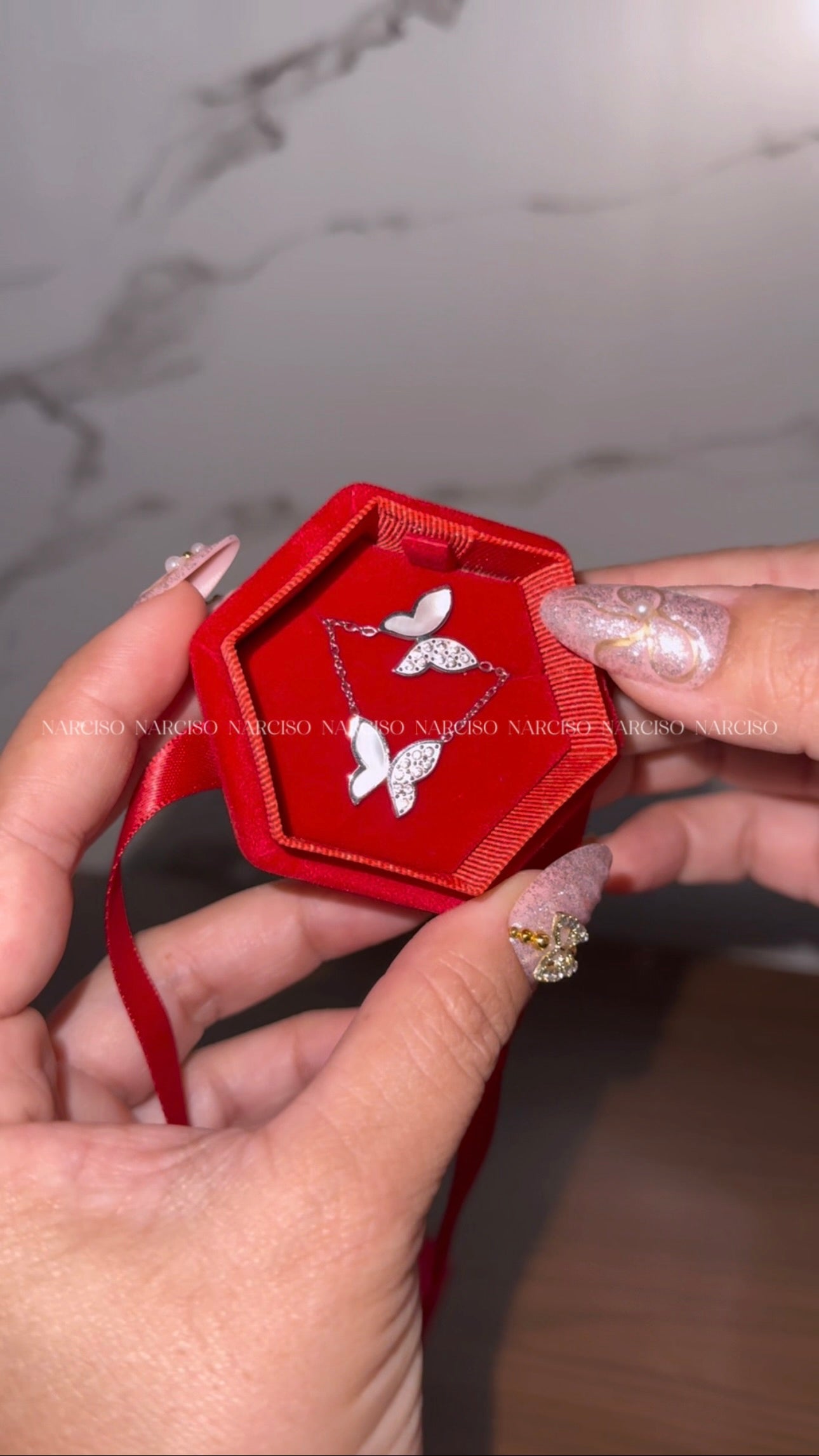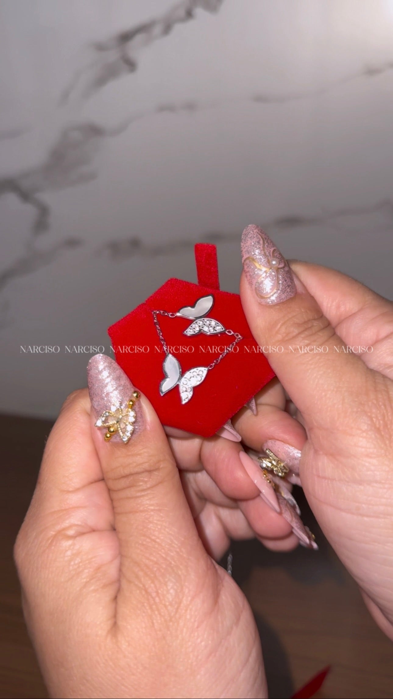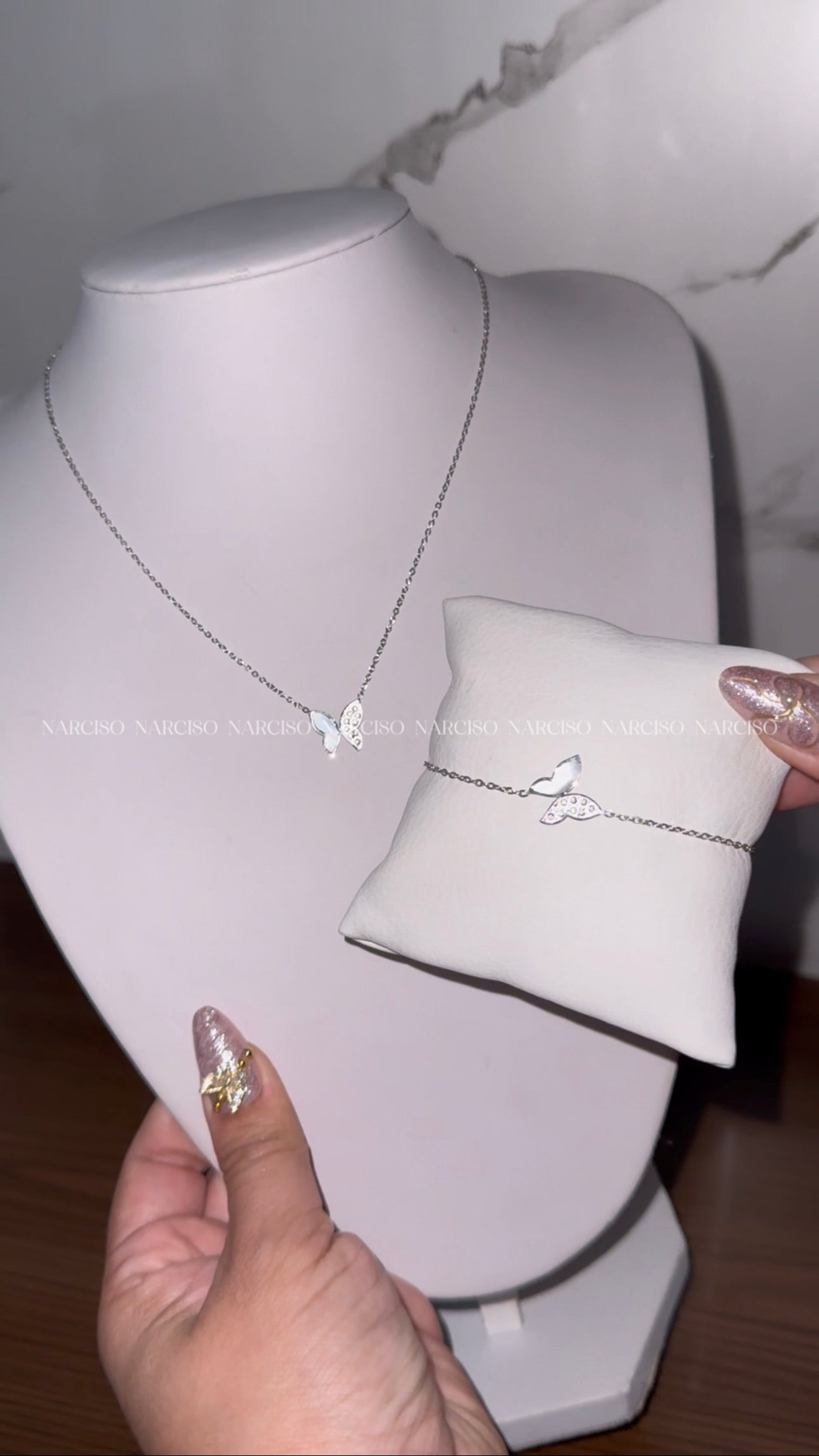 El conjunto de collar y pulsera mariposas es una muestra de elegancia y sofisticación. Confeccionados en plateado y adornados con dijes de mariposa con circonitas y concha nácar, este conjunto es perfecto para añadir un toque de glamour a cualquier atuendo. Complementa tu estilo con la belleza y la delicadeza de las mariposas.