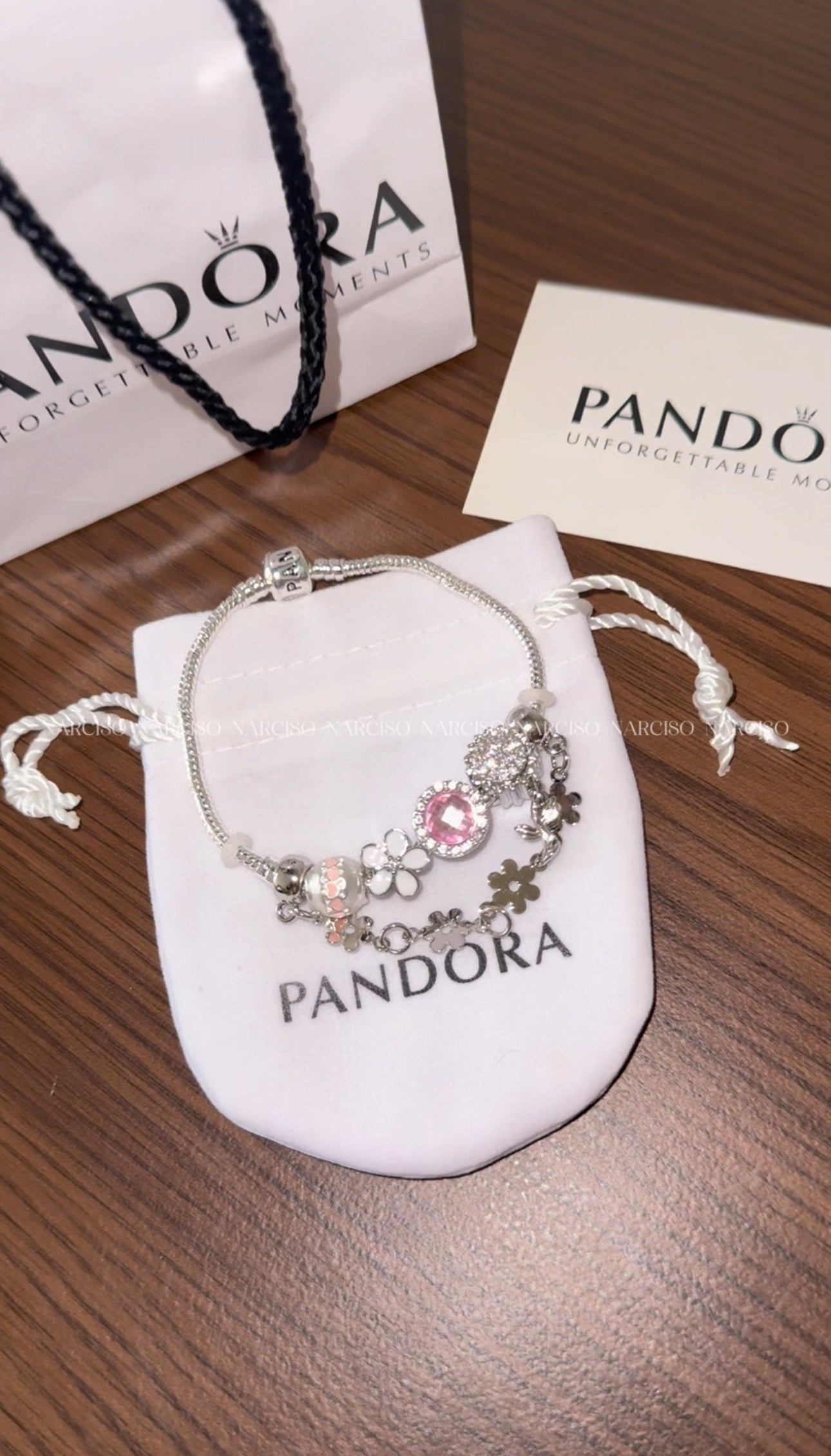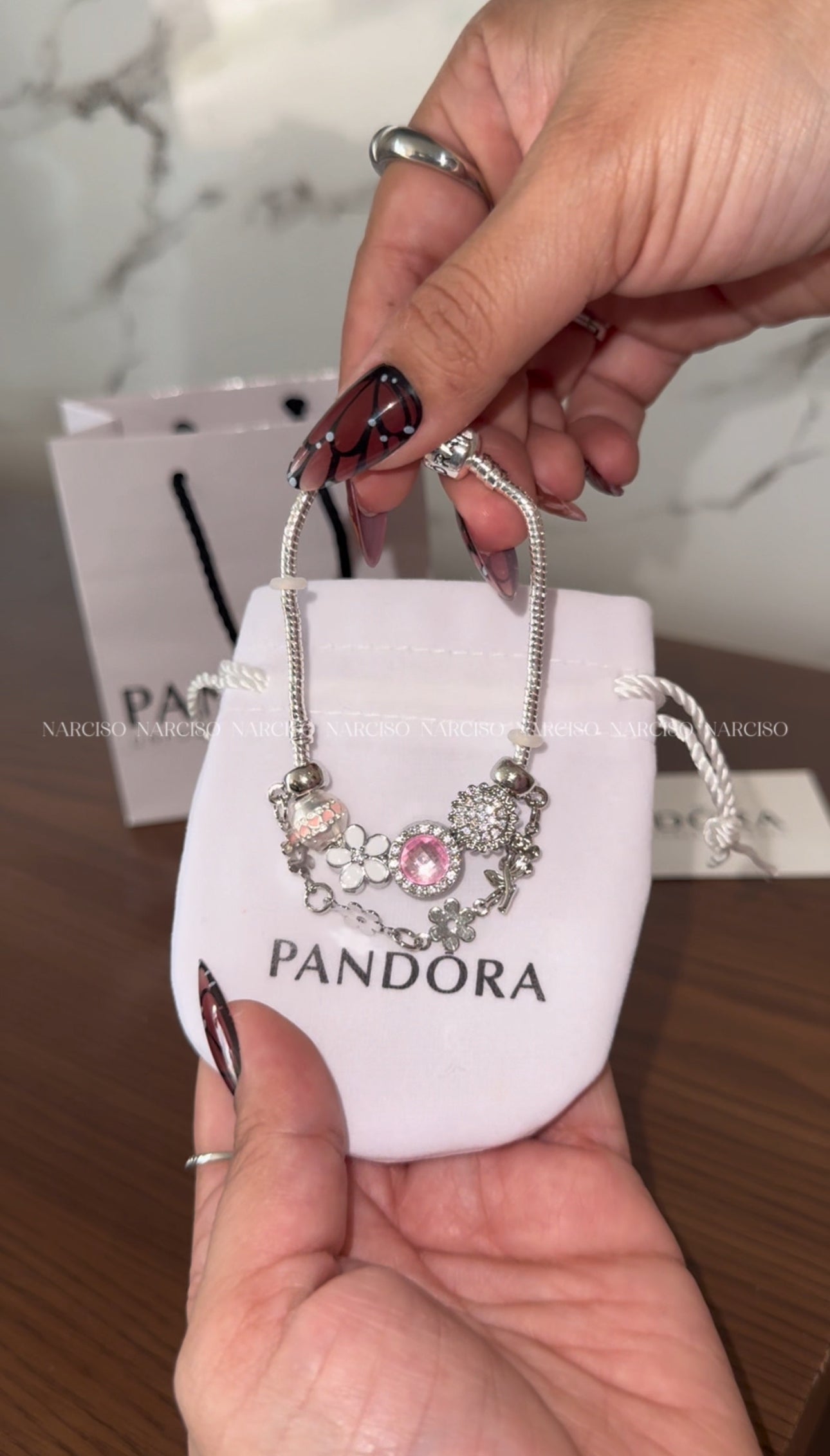 ¡Atrévete a ser única con nuestra pulsera tipo Pandora! Bañada en plata 925 con circonitas blancas y rosadas, e incluye varios charms que te acompañarán en tus aventuras. Viene en una bolsa de papel y una bolsa de tela junto con una tarjeta para dedicatoria.