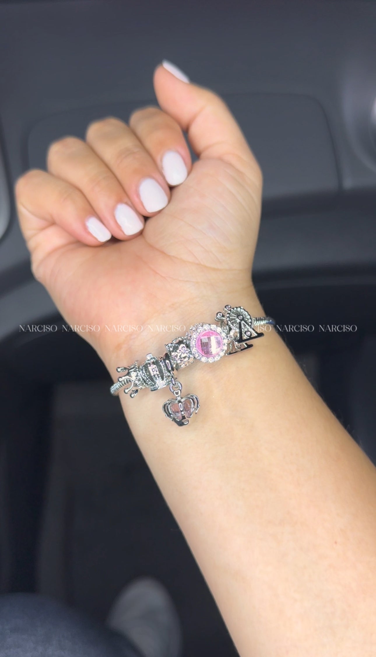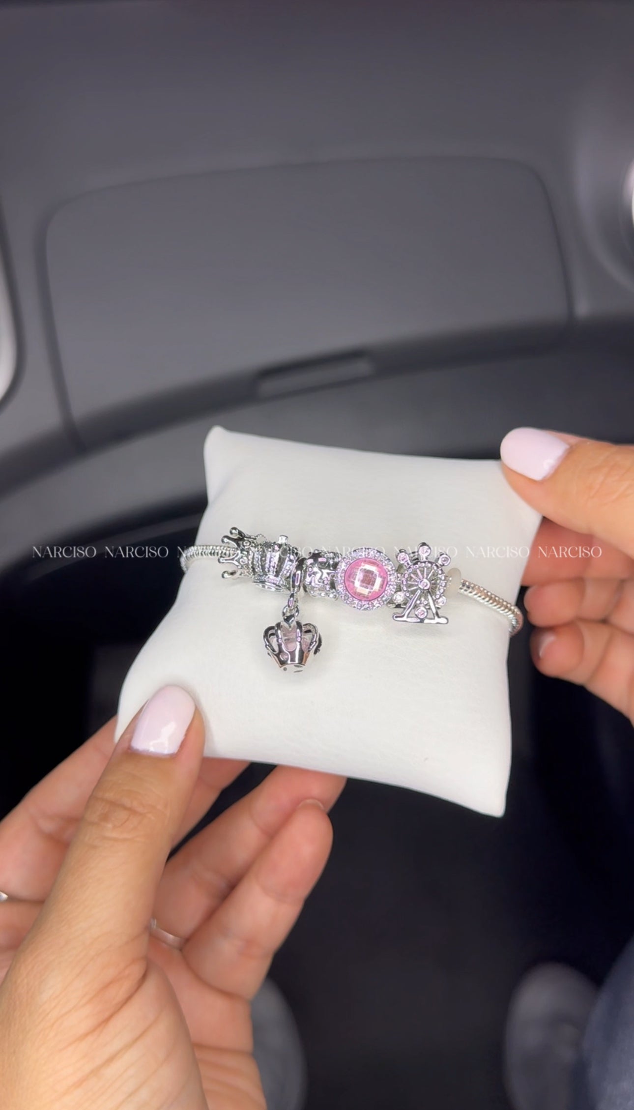 ¡Atrévete a ser única con nuestra pulsera tipo Pandora! Bañada en plata 925 con circonitas blancas y rosadas, e incluye varios charms que te acompañarán en tus aventuras. Viene en una bolsa de papel y una bolsa de tela